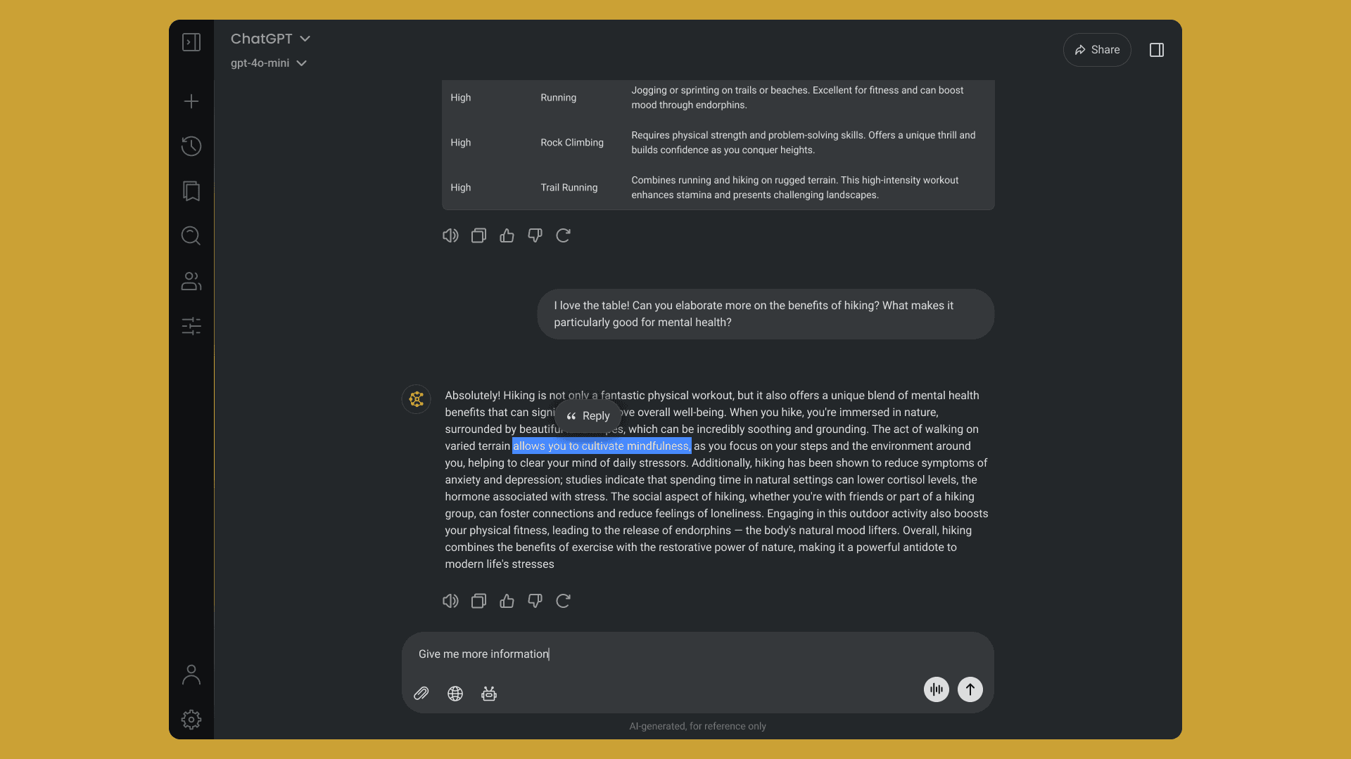 Opens a side conversation to explore a topic